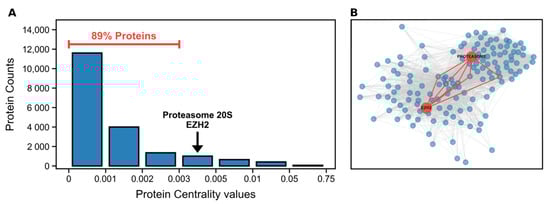 (A) Distribution of centralities across the whole human proteome, highlighting the bin containing P20S and EZH2; and (B) protein signaling network of EZH2, P20S, and all the signaling paths that connect them, with a maximum length of 4 (i.e., 2 intermediate nodes between the two target proteins). This plot contains a total of 1063 paths and 139 proteins. The blue points represent neighbours of EZH2 and P20S, grey lines indicate signaling relationships between proteins, and red lines highlight connections to immediate neighbours shared by the two key proteins.