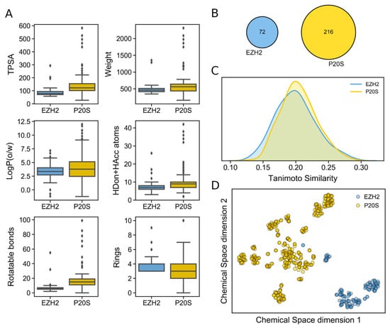 Physicochemical profile and chemical space of EZH2 and P20S inhibitors; (A) distribution of six key physicochemical properties calculated in MOE 2019.01; (B) overlap in Murcko scaffolds; (C) maximum Tanimoto similarity between each EZH2 inhibitor and all P20S inhibitors (yellow) and maximum Tanimoto similarity between each P20S inhibitor and all EZH2 inhibitors (blue); and (D) chemical space representation using t-SNE over Morgan Fingerprints.