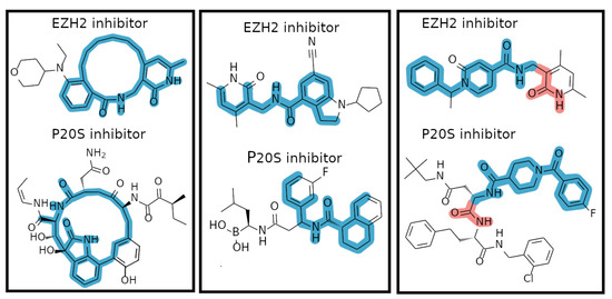 Representative examples of identified shared substructures between EZH2 and P20S inhibitors. Strictly mapped bonds/atoms are shown in blue (where aromatic only map to aromatic and aliphatic to aliphatic), and relaxed mappings (aromatic atoms can be matched to equivalent aliphatic atoms) are shown in red.