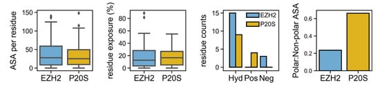 The binding pocket in P20S has a total surface of 1411.9 Å2, which is marginally smaller than the 1421.6 Å2 seen for EZH2’s pocket. The same trend is seen for the distribution of accessible surface area (ASA) values observed across pocket residues for either protein. However, while P20S’ pocket only has one highly exposed residue (>50% exposure), EZH2’s pocket shows four highly exposed residues. In addition, EZH2’s pocket has a much more hydrophobic surface as seen by the residue counts for hydrophobic versus charged atoms, as well as by the relative amount of polar surface in the total pocket surface (0.2 for EZH2 vs. 0.6 for P20S) (Figure 5). Furthermore, EZH2’s pocket has 60 hydrophobic contact points and P20S has only 41, as determined by MOE’s SiteFinder (identified pocket residues are listed in Supplementary Materials Table S1).