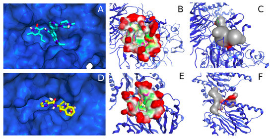 Binding pockets in EZH2 and P20S, respectively. The top row refers to EZH2’s pocket while the bottom row refers to P20S; (A,D) X-ray ligand in the binding pocket (GSK343 in cyan and bortezomib in yellow); (B,E) ligand in the binding pocket whose surface is colour-coded according to exposed (red), hydrophobic (green), and polar (pink) regions; (C,F) volume contained within the boundaries of the pocket cavity, hydrophilic (red), hydrophobic (grey). The detected pockets are defined in Supporting Table S1.