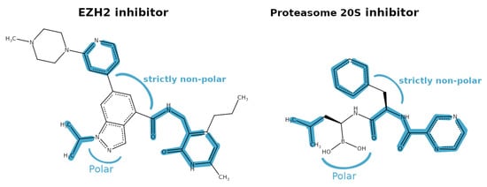 When inspecting the two X-ray inhibitors (GSK343 in EZH2 and bortezomib in P20S) we observed some common substructures and possibly overlapping polar and nonpolar regions that hint at the possible binding of both compounds into both pockets (Figure 7).