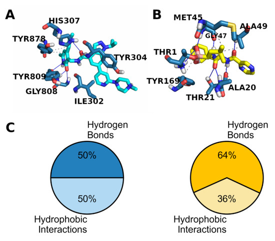 Interaction profile in the pockets of EZH2 (5WFC) and P20S (5LF3) X-ray structures (hydrogen bonds are marked by a blue line and hydrophobic interactions by a grey dashed line); (A) protein–ligand interactions between EZH2 and its X-ray ligand GSK343 (cyan); (B) protein–ligand interactions between P20S and its X-ray ligand bortezomib (yellow); and (C) distribution of interaction types found in EZH2 (5WFC) and P20S (5LF3) X-ray structures, shown in blue and yellow pie charts, respectively.