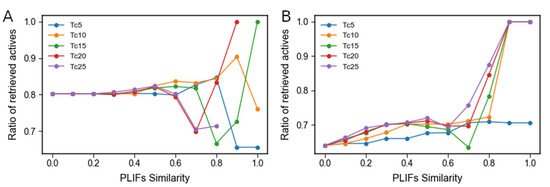 Plots of the enrichment curves calculated using the similarity of residue contacts between the ligands docked poses and the X-ray ligand. The curves are labeled in the plots as “TcN” where “Tc” refers to the Tanimoto coefficient which was the similarity function applied to the PLIFs profiles, and “N” is replaced by the amount of top N most frequent contacts observed in the ChEMBL datasets screened; (A) enrichment curves for the EZH2 inhibitors dataset, among which the yellow curve (using 10 residues) was selected to filter new predicted EZH2 inhibitors among known P20S inhibitors; and (B) enrichment curves for the P20S inhibitors dataset, among which the red curve (using 20 residues) was selected to filter new predicted P20S inhibitors among known EZH2 inhibitors.