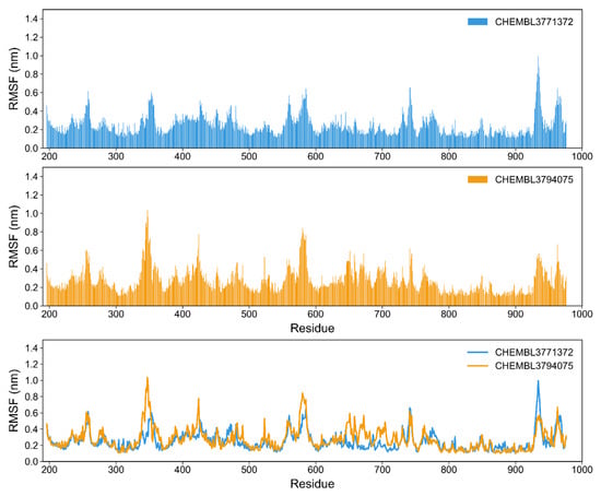 RMSF plots of the EZH2 for the simulations with both selected molecules, CHEMBL3771372 and CHEMBL3794075. Residue IDs in the x-axis refer directly to the sequence numbers associated with 5WFC.