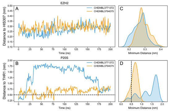Distance from both docking hits to EZH2’s HIS307 (A) and to P20S’s THR1 (B). Distribution of minimum distances to HIS307 (C) and THR1 (D) recorded throughout the full 200 ns simulation.