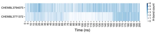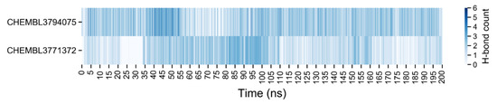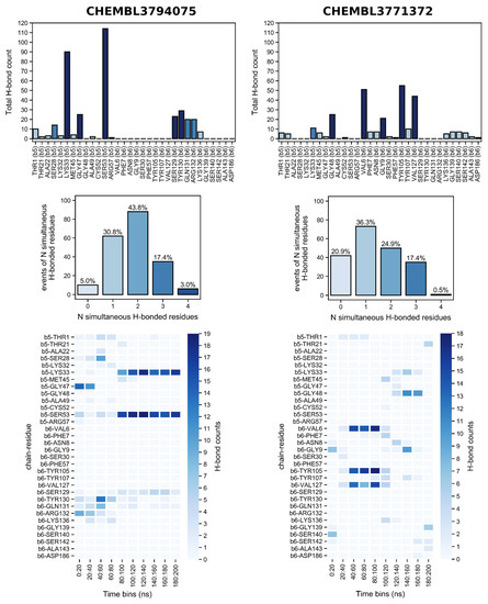 Regarding the distance monitoring in P20S, CHEMBL3794075 remains in a much closer distance to P20S’ THR1 throughout the whole simulation, when compared to CHEMB3771372. In fact, while the latter shows only 6.0% of timepoints within 5 Å distance (and all happening at the start of the simulation), the former shows 16.4% of timepoints with this distance. The difference between the distances for the two ligands is also evident from the analysis of the distribution of distance values (Figure 16B,D). Other authors have used this distance as an indicator of the formation of covalent bonds [41] but regardless of whether our compounds are covalent or noncovalent inhibitors, a low distance indicates a higher likelihood of the formation of a stable complex within the P20S pocket. Interestingly, CHEMB3771372 remained outside of the binding pocket for most of the simulation but returned to the β5 binding pocket. However, distance alone is not enough to establish whether the formation of a stable complex is likely to occur, so next we evaluated the H-bonding profile for both ligands.