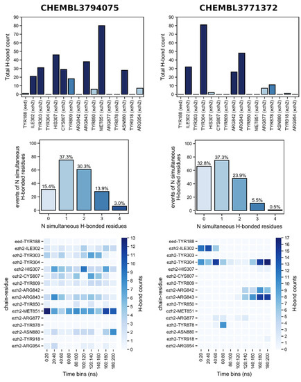 Regarding the docking in EZH2, as expected CHEMBL3771372 (a known EZH2 inhibitor) shows a high resemblance with the pose of EZH2’s X-ray ligand, where the shared substructure between the two is closely overlaid (Supporting Figure S2). Despite being quite different structurally from the previous two, CHEMBL3794075 is placed deep inside the binding pocket (Supporting Figure S2). The X-ray cocrystallised ligand forms hydrophobic interactions with residues ILE302, TYR304, and TYR878. However, CHEMBL3771372 only shows hydrophobic interactions with PHE305 and ARG877, and CHEMBL3794075 with ARG877 and TYR878. This may be caused by the smaller size of both hit compounds. The X-ray cocrystallised ligand establishes H-bonds with TYR304, GLY808, and TYR809, of which two are shared with CHEMBL3771372 (TYR304 and TYR809). On the other hand, CHEMBL3771372 forms an additional H-bond with HIS307. CHEMBL3794075 shows all H-bonds observed for the X-ray cocrystallised ligand (TYR304, GLY808, and TYR809) with additional H-bonding to HIS307 and ASN880. Additionally, the X-ray cocrystallised ligand shows two concerted H-bonds between the same carbonyl oxygen and both TYR304 and HIS307, which is also observed in both docking hits. Zhou et al. [29] unveiled a series of pyrrole 3-carboxamide in which hydrophobic interactions with TYR111 (TYR304 in our case), TYR558 (TYR851 in our case), and PHE562 (PHE855 in our case), as well as double hydrogen bonds with TRP521 (TYR809 in our case), are critical for EZH2 inhibitory activity. In the residue correspondence, even though the residues are not of the same type, the OH donor of TYR809’s side chain is very close to the NH donor of TRP521’s side chain, allowing for the previously identified double bonding. Likewise, the EZH2 inhibitors in clinical trials all have similar and unique pyridone moieties, which are required to enhance binding to the EZH2 SET domain in a cofactor-competitive manner via forming two hydrogen bonds with TRP521/TYR809.