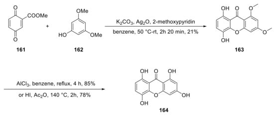 The first synthesis of xanthone glucosides was accomplished by Wagner in 1985 (Scheme 1) [130]. Three xanthones, 1-(β-d-glucosyloxy)-8-hydroxy-3,5-dimethoxyxanthone (35) [80], 8-(β-d-glucosyloxy)-1,3,5-trihydroxyxanthone (36) [81] and norswertianolin (72) [92], were synthesized in one sequence. Starting with the nucleophilic addition of 3,5-dimethoxyphenol (162) to 2-methoxycarbonyl-1,4-benzoquinone (161), 5,8-dihydroxy-1,3-dimethoxyxanthone (163) was obtained at 21% yield. The compound 1,3,5,8-tetrahydroxyxanthone (164) was completed by refluxing 163 with AlCl3 in benzene for 4 h or heating 163 with HI and Ac2O at 140 °C Compound 164 then went through different steps to form three compounds: 5-benzyloxy-l,3,8-trihydroxyxanthone (165), 1,3,5-tribenzoyloxy-8-hydroxyxanthone (166), and 1,8-dihydroxy-3,5-dimethoxy (167). Then, taking 165–167 as aglycons, coupling with α-acetobromoglucose successfully afforded the corresponding products 72, 36, and 35.