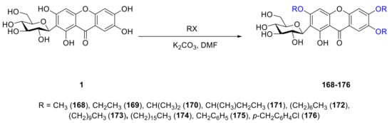 The structure of mangiferin (1) is 2-(β-d-glucosyloxy)-1,3,6,7-tetrahydroxyxanthone, which is distributed in a variety of plants and has demonstrated many biological activities. To improve the solubility of 1, several mangiferin derivatives were synthesized by Wu and coworkers (Scheme 2). They used nucleophilic substitution to add alkyl or benzyl groups to the skeleton of mangiferin and nine derivatives 168–176 were obtained [131].