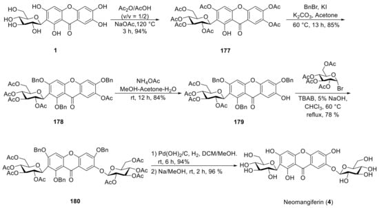 - Wei, X.; Liang, D.; Wang, Q.; Meng, X.; Li, Z. Total synthesis of mangiferin, homomangiferin, and neomangiferin. Org. Biomol. Chem. 2016, 14, 8821–8831. [Google Scholar] [CrossRef]