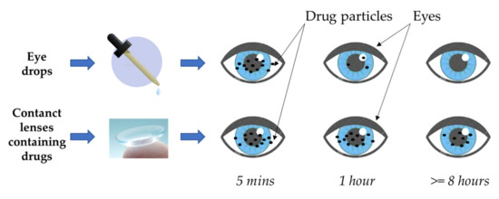 The incorporation of drug-containing nanoparticles into the polymer matrix of the contact lens is an effective strategy for sustained drug delivery. This approach allows sustained drug release to be adjusted to the patient’s needs, from a few hours to several weeks. Nanoparticles (10 to 100 nm) act as a barrier against metabolic degradation during the release of drugs to the eye surface [105]. Through chemical bonds, functionalised nanoparticles can be incorporated in soft contact lenses by the polymerisation reaction, infiltration, or immobilisation on the contact lens surface [35]. It has been shown that nanoparticle-functional contact lenses demonstrate significantly longer retention times than eye drops containing drug nanoparticles [35,105].