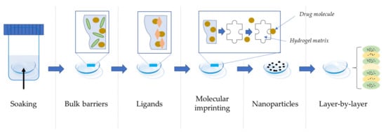 In recent decades, attempts have been made to extend drug residence time and improve the bioavailability of various lens-based drug delivery systems. SCLs surface modifying methods include dip-coating (soaking); diffusion barrier insertion (Vitamin E); incorporation of functional monomers, ligands, and a polymeric matrix; molecular imprinting, cyclodextrin vaccination [59], incorporation of colloidal, drug-loaded nanoparticles or other colloidal nanostructured systems; and surface coating by multilayer film deposition of colloidal nanoparticles or ligands [5,12,28,58,60] (Figure 2).
