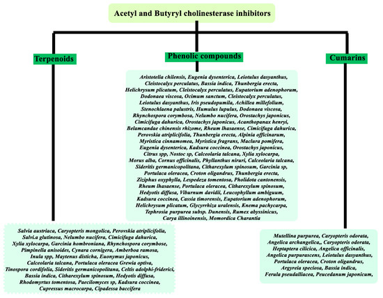 Alkaloids include a high number of compounds with anticholinesterases, though some terpenes, coumarins, and lignans have been shown to have this activity. Recently, research has targeted alkaloid compounds as potent anticholinesterase compounds and little attention has been given to other classes. In this review, we report a representative update of terpenoids, phenolic, and coumarin compounds with their AChE and BChE inhibitory potentials according to reports from 2009 to 2021.