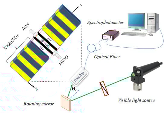 Details of the central core of the suggested photonic biochip and the other involved parts are schematically illustrated in Figure 1. As with any standard biosensor, there exists three main parts in this sensing system: the light source, core of the sensor, and analyzing section. The visible probe light passes through the appropriate polarization optics, to be polarized in a specific manner. In more detail, the probe light is transferred from a thin-film polarizer to be linearly polarized. Then, it is conducted to propagate through a phase retarder, in order to control the phase difference between the TE and TM components and reach any state of elliptical polarization. Light is then passed through the bio-chip, using a rotating mirror that can also tune the light incident angle on the sensor core. The light transmitted through the chip is captured by an optical fiber placed at the other side of the chip and conducted via the spectrophotometer, with which the transmittance spectrum might be recorded. As is shown in the 3D stereogram, in the same figure, the bio-chip is made of stacks of ZnS/Ge alternating layers, placed at two sides of the bio-cell, which were filled/emptied through nanofluidic channels. It is worth noting that deposition of Ge layers on ZnS slabs has been already performed successfully in experiments [24,25]. It has been shown that, when controlling the deposition time, it is possible to control the layer’s thickness [26]. Then, the suggested configuration could be easily implemented in practice. Thus, the heterostructure is considered as (ZnS/Ge)N bio-cell (ZnS/Ge)N, where N is the repetition number of unit-cells stacked along the z-axis. Interfaces of the layers are considered parallel to the x-y-plane, and the z-axis is assumed to be normal for the structure. Surrounding the atmosphere is air, and the light incident angle is measured with respect to the z-axis. The thickness of the deposited layers might be determined simply using scanning electron microscope (SEM) imaging from a cross section of the structure. Another alternative, that can also provide information regarding the refractive index and extinction coefficient distribution inside the structure (and thus, the information of the layers thickness) is using the ellipsometric approach. However, this method has some more difficulties, as extra data analysis and fitting procedures are necessary after experimental measurements [27]. Two side walls of the bio-cell, that are along the probe light propagation direction, are covered by a graphene sheet, to benefit from the advantages of the 2D-materials. The number of sheets on each wall is just one, and their oxidation degree is considered to be zero. In experiment, the layers of graphene sheets could be deposited by using the valuable method presented in [28]. In this approach, Suk et al. have suggested a wet transfer method, to relocate chemical vapor deposition (CVD) grown monolayer graphene sheet onto a flat glass substrate at surface area as large as 1 cm × 1 cm. They have reported a transmittance amount of over 97% for the glass substrate covered by the monolayer of the graphene sheet @ λ = 550 nm (which is in the wavelength range being considered in our study).