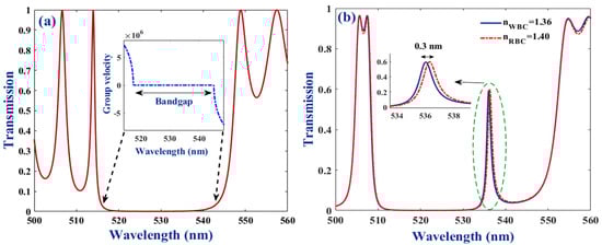 The transmittance spectrum of a uniform multilayer structure made of alternating layers of ZnS and Ge slabs is illustrated in Figure 2a. It is clear that a wide band gap as large as ~27 nm is generated in the visible spectral domain when 8 periods of (ZnS/Ge) unit-cells are considered. The inset (in the same figure) represents data for the group velocity (GV) in the vicinity of the band gap spectral interval. Results show that GV possesses positive and negative values outside the band gap region and reaches zero in the gap range, in support of the behavior observed in transmittance spectrum. Panel (b) in Figure 2 illustrates the transmittance spectra for the structure with a geometry of (ZnS/Ge)4 bio-cell (ZnS/Ge)4 when it is filled with white and red blood components. Comparing the results in panels (a) and (b), it is clear that the resonant modes generated inside the stop band are due to the disruption of the structure symmetry and presence of the filled bio-cell. The resonant modes have almost the same intensity and are separated by just a 0.3 nm wavelength. Almost a total overlap was observed at other parts of these spectra. Thus, the structure can identify the WBC and RBC samples but its detectivity might not be that useful in practice.