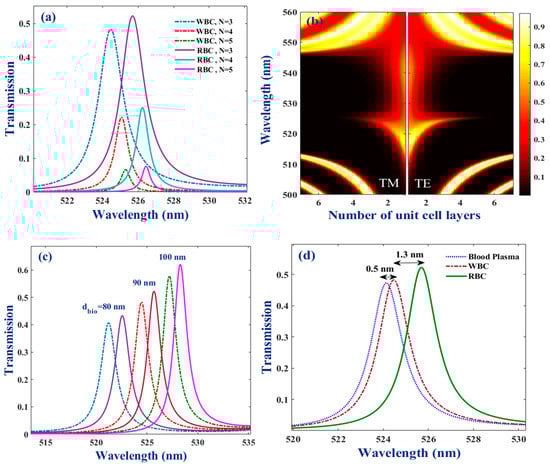Panel (b) in Figure 4 presents a colormap of the transmittance versus wavelength at the period numbers of 1 to 7 for two light polarization states of TE and TM. These data belong to when the bio-cell is filled by the WBC sample. Similar behavior was observed the for RBC sample and in order to avoid similar discussions it has not been reported in manuscript. It is clear that the size of the band gap was independent of the light polarization for all considered period numbers. Additionally, the central wavelength of the resonant mode was the same at two cases, i.e., independent of the probe light polarization state. The resonant mode was generated inside the stop band at the same wavelength. For both polarizations, at least three periods are necessary to reach a reasonable sharpness for the resonant mode. To further increase the period number, the mode becomes narrower until it disappears. However, it is also clear that at each period number, the width of the mode was, to some extent, more for the TM polarization and in this case the mode was suppressed to a large extent at N ≥ ~4. In the case of the TE polarization state, the resonant mode had a remarkable intensity, even at N = 5. Then, it was discovered that the suggested bio-chip had a proper response at both the TE and TM polarizations but using the TE state was better, in comparison. Thus, the TE polarization state is considered in the following, as the generation of the sharper resonant modes with higher intensities that do not suppress even up to N = 5 periods was possible in this case.