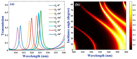 The light incident angle was selected as another parameter for the simple tuning of the response of the suggested bio-chip. As a result, in the following, the dependence of the resonant mode characteristics on this angle are explored in detail. It was observed (Figure 5) that by increasing the incident angle from 0° to ~42°, peaks related to both the resonant modes of WBC and RBC, the samples experienced remarkable blue shifts. The amount of shift at low angles was much less, compared to higher ones. Besides, the deviation of the light incident angle from the normal direction results in the reduction of the resonant peak’s intensity amount. However, the reductions take place almost equally for both modes, which leads to the preservation of their intensity difference at all angles. However, their separation increases to some extent at higher degrees. Panel (b) of Figure 5 illustrates transmittance of the bio-chip filled by WBC sample versus wavelength for incident angle range of 0–85° in a colormap format. It is clear that changing the incident angle, not only the resonant mode inside the gap but also the limits of the stop band, as well as its size is affected. So that at normal incidence the resonant mode is generated at nearly middle of the stop band. However, increasing the angle it blue shifts followed by the blue shift that takes place for right-hand side limit of the gap. Additionally, the wavelength interval of the gap is seriously dependent on the incident angle. Finally, at θ ~42° the resonant mode reaches the left-hand side limit of the selected spectral range. However, at higher incident angles, once again, a wide stop band is generated in which the resonant mode, related to presence of the bio-sample, is very wide at first and close to the right-hand side boundary. Increasing the incident angle, its width reduces remarkably and its blue shifts, significantly.