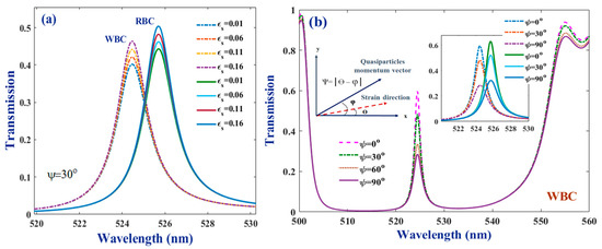 Figure 6, Figure 7 and Figure 8 indicate how the resonant modes of the WBC and RBC samples change with the physical status of the coated graphene sheets at the side walls of the bio-cell. These results show that the optical response of the suggested bio-chip is dependent on not only the strain amount applied to the graphene sheets but also with the angle in which the stain is realized. According to panel (a) in Figure 6, when increasing the strain amount, the central frequency of both modes does not change. However, their intensity increases continually (almost equally for both samples) and their full width, at half maximum (FWHM), also reduces to some extent. Thus, the separation of the resonant modes and the difference in their intensity amounts remains constantly independent of the strain applied to the graphene sheets. However, they become more detectable as their intensity increases. Strain direction and how the ψ angle is defined, with respect to the direction of the quasiparticles momentum vector, are presented schematically in an inset in Figure 6b. The results illustrate that changing the angle of ψ (which, as described, contains information about the angle at which the strain is applied) the interval of the band gap region and its transmittance amount does not change (except for some possible small distortions at the upper corners of the left- and right-hand side limits of the band gap); the physical features of the band gap do not depend on the value of ψ parameter. However, increasing the ψ value the intensity of the resonant mode reduces remarkably, and its FWHM also increases. In other words, the sharpest resonant peak with the greatest amount of intensity belongs to the case of ψ = 0°. Similar behavior was observed in the case of the RBC sample (presented in inset at the same panel). Additionally, it is clear that by changing the ψ angle, resonant modes, related to the WBC and RBC samples, are changed in a way that their intensity difference, as well as their separation in wavelength, remains constant.