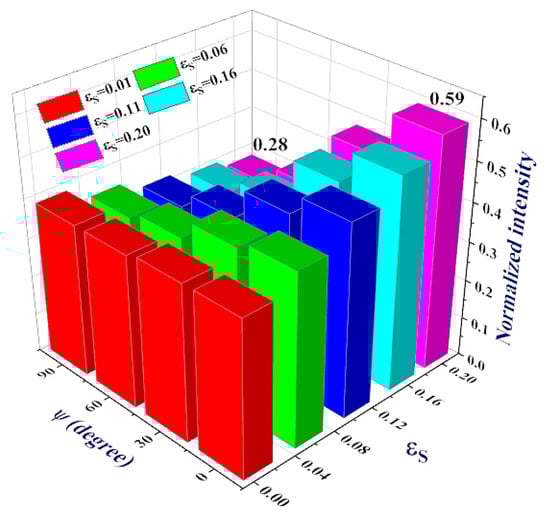 The most remarkable descending jumps take place for the maximum selected amount of Ɛs = 0.2. In summary, the maximum intensity of ~60% was observed at a maximum selected strain amount of Ɛs = 0.2 and the minimum value of ψ = 0°. In reverse, the minimum intensity (28%) is realized at the same amount of strain but maximum angle of ψ = 90°, as has also been illustrated in Figure 7. Table 2 presents the quantitative values of the discussed parameters, to make it easy to evaluate the biosensor performance.