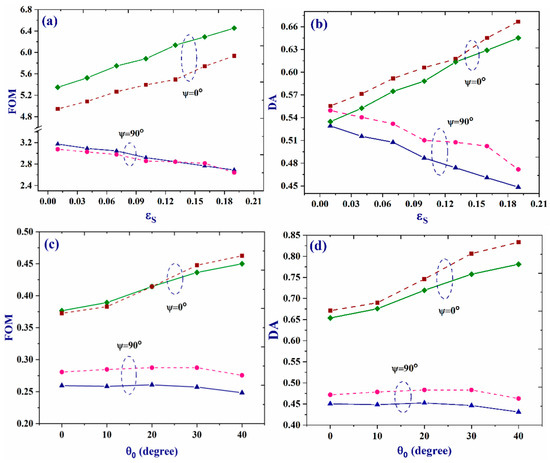 Values of figure of merit (FOM) (a,c) and detection accuracy (DA) (b,d) versus Ɛs and light incident angle for two samples of WBC (solid lines) and RBC (dashed lines), at ψ = 0° and 90°. The values θ0 and Ɛs are considered as 0° and 0.2 in panels (a,b) and (c,d), respectively.