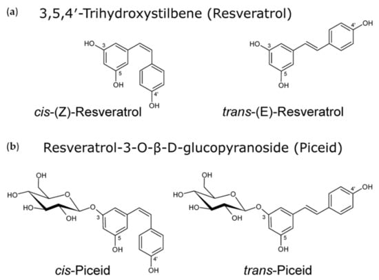 The trans-isomer exhibits multiple properties such as antioxidant [1,2], anti-inflammatory [3], neuroprotective [4], immunomodulatory [5], antiproliferative [6,7], and anti-metastatic [8,9] effects. In the context of human hepatoblastoma cells, trans-resveratrol is an inhibitor of classical histone deacetylases of classes I, II, and IV, which are involved in cancer development and progression [10]. Moreover, trans-resveratrol enhances NK cell killing activity by induced expression of activating cell surface receptors such as natural-killer group 2 and member D (NKG2D) [11]. Naturally, the trans-isomer can be converted to the cis-configuration by UV irradiation. Resveratrol and its consumption, primarily in the form of red wine, gained public attention as it was held responsible for the so-called “French paradox”, a term illustrating the lower mortality rate from coronary heart disease in France compared to the rest of Europe and the USA, despite a high intake of saturated fat [12]. It is known that grapes mainly contain trans-resveratrol in its glycosidic form (trans-piceid, trans-resveratrol-3-O-β-D-glucopyranoside; Figure 1), in contrast to red wines, which are a source of both aglycones of cis- and trans-resveratrol in often comparable amounts due to sugar cleavage during vinification [13]. To date, piceid and aglycone content of both resveratrol isomers have been determined for a multitude of wines of different origins [14,15,16], but laboratory investigations still mostly concentrate on the biological effects of trans-resveratrol. The characteristics of the cis-isomer are much less studied, probably due to its lower steric stability compared to the trans-isomer, its extreme photo-sensitivity [17] under standard laboratory conditions, and the fact that it was not commercially available as pure compound until recently. For a long time, cis-resveratrol could only be obtained by photodiastereomerization of the trans-isomer [18]. The natural origin of the cis-isomer can further be the production from trans-resveratrol by yeast isomerases during wine fermentation, the release from resveratrol polymers (viniferins), or from resveratrol glycosides [19,20].