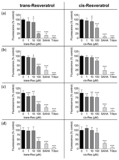 Cells were seeded in 24-well plates (2 × 104 cells/well) in a volume of 550 µL as triplicates and incubated overnight. Next, the medium was discarded and replaced with culture medium supplemented with 0.1, 1, 10, or 100 µM cis- or trans-resveratrol, respectively. As positive control, SAHA at 10 µM concentration was used. Complete cell death as control was induced by lysing cells with 1% (v/v) Triton X-100 (Roth, Karlsruhe, Germany) immediately before SRB staining. Growth inhibition was evaluated after an incubation time of 72 h by SRB assay. During the procedure, medium was discarded and each well was washed once with ice-cold PBS (phosphate buffered saline) and fixed with 10% trichloroacetic acid (TCA) for 30 min at 4 °C. After washing with tap water, cells were dried at 40 °C, then the proteins were stained for 10 min with SRB (0.4% (w/v) in 1% (v/v) acetic acid; CAS 3520-42-1, Sigma–Aldrich), and finally, after removing unbound dye by washing with tap water and 1% (v/v) acetic acid at the end, dried again at 40 °C. Protein-bound dye was resolved with 10 mM Tris base (pH 10.5). After 10 min incubation at room temperature, optical density was measured in triplicates of 80 µL volume per well in 96-well plates with GENios Plus (Tecan; measurement wavelength 550 nm, reference wavelength 620 nm). Data represent the mean of optical density values related to untreated control cells.