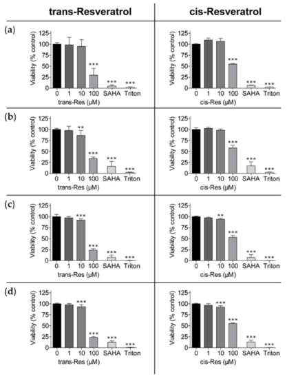 Reduced cell mass of hepatoma and colon carcinoma cells with different p53 status by trans- and cis-resveratrol shown by SRB assay. (a) HepG2, (b) Hep3B (hepatoma), (c) HCT-116, and (d) HCT-116/p53(−/−) (colon carcinoma) cells were exposed to different concentrations of trans- and cis-resveratrol (1 µM, 10 µM, 100 µM) for 72 h; 10 µM SAHA served as positive control and 1% (v/v) Triton X-100 was added as a cell death control. The experiments were replicated in three independent experiments, each performed in triplicates. Results are shown as percentages compared to the untreated control. Error bars represent mean ± SD, statistical analysis with the Dunnet’s multiple comparison test, confidence interval 95%. **: p ≤ 0.01; ***: p ≤ 0.001. Res, resveratrol; SAHA, suberoylanilide hydroxamic acid; SRB, sulforhodamine B.