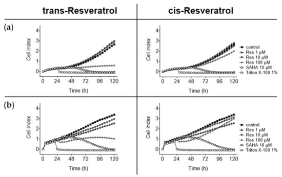 In order to additionally analyze the temporal onset of growth impairment and cell death, a real time proliferation assay was performed using HepG2 and Hep3B cell lines as examples. In both cases, 100 µM trans-resveratrol induced delayed cell proliferation compared to 100 µM cis-resveratrol (Figure 4). An amount of 100 µM trans-resveratrol directly delayed Hep3B proliferation and stopped cell growth after approximately 72 h; in the case of HepG2, no proliferation was detectable immediately after the addition of 100 µM trans-resveratrol. Hep3B cells had some sensitivity to both resveratrol-isomers at lower concentrations. SAHA induced pronounced effects after only 12 h in Hep3B and after 24 h in HepG2, until most cells were dead after 96 h (Hep3B) and 48 h (HepG2), respectively.