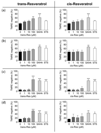 Cells (5 × 105) of the different tumor cell lines were seeded in 6-well plates in a volume of 2 mL, and the following day exposed to the resveratrol isomers and SAHA at the above-mentioned concentrations. As control for apoptosis, STS stock solution (Enzo Life Sciences) was added 20 h before flow cytometry at a final concentration of 5 µM. After 72 h of incubation, mitochondrial transmembrane potential damage was determined by TMRE staining. For this purpose, cells were collected after detachment with trypsin, together with medium and PBS used to wash the plates. Cells were centrifuged at 200 g for 4 min, the supernatant discarded, and the cell pellet once washed with PBS. The cell pellet was then resuspended in 100 nM TMRE (Thermo Scientific, Schwerte, Germany) in PBS, and cells were stained for 30 min at 37 °C. Finally, cells were washed again with PBS and resuspended in 1 mL PBS supplemented with 1% (v/v) FCS. A NovoCyte 2060R flow cytometer (Agilent Technologies Inc.) was used for measurements; data were analyzed with NovoExpress 1.4.1 software (Agilent Technologies Inc.). For each measurement, 1 × 104 events were counted.