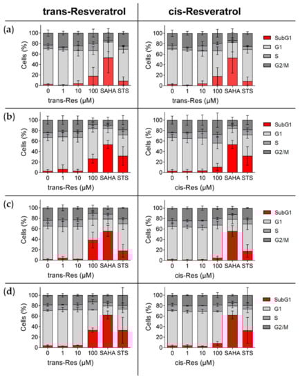 Cells (5 × 105) of the different tumor cell lines were seeded in 6-well plates in a volume of 2 mL, and the following day exposed to the resveratrol isomers and SAHA at the above-mentioned concentrations. As control for apoptosis, STS stock solution (Enzo Life Sciences) was added 20 h before flow cytometry at a final concentration of 5 µM. After 72 h of incubation, cell cycle analysis was determined by PI staining. For this purpose, cells were collected after detachment with trypsin, together with medium and PBS used to wash the plates. Samples were centrifuged at 200 g for 4 min, the supernatant discarded, and the cell pellet washed once with cold PBS (4 °C). Subsequently, the cells were fixated with 1 mL ice cold 75% ethanol and mixed gently, and then placed in the fridge for at least 2 h. Thereafter, 2 mL of cold PBS was added and samples were centrifuged again (200 g, 10 min, 4 °C), followed by carefully aspirating the supernatant. Cells were then washed once with cold PBS and stained with PI/RNAse solution while gently vortexing (PI 50 µg/mL (Sigma–Aldrich) + 100 µg/mL RNAse (Sigma–Aldrich)), and then incubated for at least 20 min at 4 °C in the dark. A NovoCyte 2060R flow cytometer (Agilent Technologies Inc.) was used for measurements; data were analyzed with NovoExpress 1.4.1 software (Agilent Technologies Inc.). For each measurement, 1 × 104 events were counted.