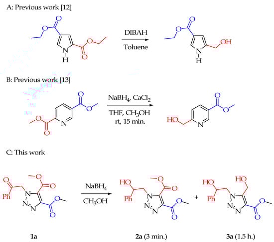 We elected to pursue work directed towards possible selective reduction of five-membered ring heteroaromatic diesters. As representatives of these, neither of the ester groups of dimethyl imidazole-4,5-dicarboxylate were reduced by NaBH4 in MeOH/THF, but chemoselective reduction [25] was achieved for the N(1) ketone of dimethyl 1-(2-oxo-2-phenylethyl)-1H-1,2,3-triazole-4,5-dicarboxylate (1a) (C of Scheme 1) to form dimethyl 1-(2-hydroxy-2-phenylethyl)-1H-1,2,3-triazole-4,5-dicarboxylate (2a), followed later by regioselective reduction to form methyl 5-(hydroxymethyl)-1-(2-hydroxy-2-phenylethyl)-1H-1,2,3-triazole-4-carboxylate (3a). In our earliest experiment for reaction of 1a, we anticipated the reduction with NaBH4 to reduce the ketone, but not the ester. The ketone was reduced, but some ester reduction was also observed. Adding more NaBH4 and waiting for the reaction to finish gave 3a in good yield, with the ester group at C(4) being unreactive, although initially we did not know which of the ester substituents had been reduced. This turned out to be an excellent example of a regioselective process. We chose to investigate the scope of the selectivity of diester reduction of 1a, along with related compounds. Ester reduction was understandably more likely for 1a than for the more electron-rich imidazole 4,5-diesters. An important issue was how a hydroxy group as part of the N(1) substituent might influence the outcome of the ester reduction or the reduction rate of 1a. We posited that a hydroxy group might be required in order to observe selective reduction of 1a, which turned out not to be the case.