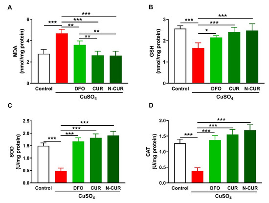 N-CUR and CUR attenuate Cu-induced cerebral oxidative stress. Treatment with N-CUR, CUR, and DFO decreased MDA (A) and increased GSH (B), SOD (C), and CAT (D) in the brain of Cu-administered rats. Data are mean ± SEM, (n = 8). * p < 0.05, ** p < 0.01, and *** p < 0.001.