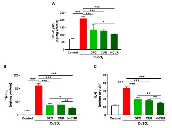 N-CUR and CUR suppress inflammation in Cu-administered rats. Treatment with N-CUR, CUR, and DFO decreased cerebral (A) NFκB p65, (B) TNF-α, and (C) IL-6. Data are mean ± SEM, (n = 8). * p < 0.05, ** p < 0.01 and *** p < 0.001.