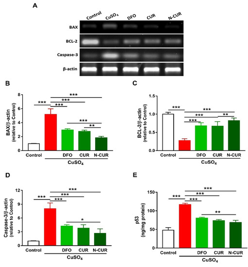 N-CUR and CUR prevent apoptosis in Cu-administered rats. (A) Representative blots showing changes in the expression of BAX, BCL-2, and caspase-3. (B–E) N-CUR, CUR, and DFO decreased (B) BAX, increased (C) BCL-2, and downregulated (D) caspase-3, and (E) p53 expression in the brain of Cu-administered rats. Data are mean ± SEM, (n = 8). * p < 0.05, ** p < 0.01 and *** p < 0.001.
