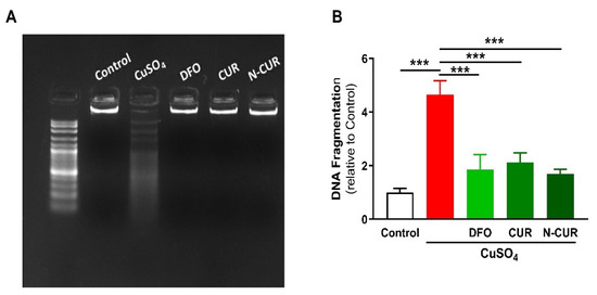 The beneficial effects of CUR and N-CUR against Cu-induced cerebral cell death were further confirmed via assessment of DNA fragmentation (Figure 4). Cu-administered rats showed an increase in DNA fragmentation levels as compared to the control group (p < 0.001). All treatments (DFO, CUR and N-CUR) prevented the deleterious effect of Cu on DNA integrity.