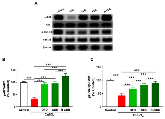N-CUR and CUR upregulate AKT/GSK-3β signaling in Cu-administered rats. (A) Representative blots of pAKT, AKT, pGSK-3β, and GSK-3β. (B,C) N-CUR, CUR, and DFO increased AKT Ser473 (B) and GSK-3β Ser9 (C) phosphorylation in the brain of Cu-administered rats. Data are mean ± SEM, (n = 8). *** p < 0.001.