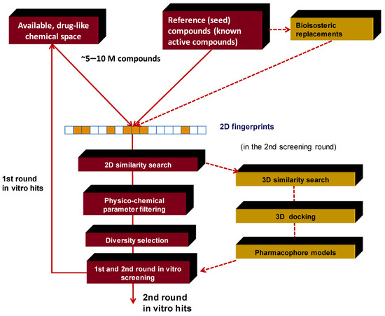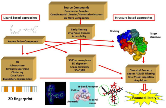 Virtual screening (VS) has become a popular technique [1] since it was expected to reduce the synthesis and biological screening cost and shorten the life cycles of the discovery phases. Over the past two decades, huge compound repositories were built exploiting historical collections as well as compound libraries. At the same time, the chemoinformatics methods have developed rapidly and the computational power increased, allowing fast or real time calculations. In addition, deeper knowledge has been developed about the small molecule–protein interactions using state-of-the-art X-ray crystallography, docking, and 3D modelling [2]. The major elements and the most important VS approaches are shown in Figure 1. The in vitro screening of the focused libraries often result in a many fold increase in the hit rate compared with random screening of commercial libraries [3,4].