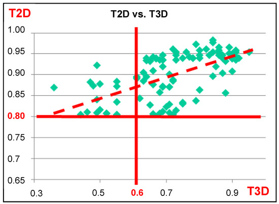 Correlation between T2D and T3D values of the compounds (104) selected for the second round screening.