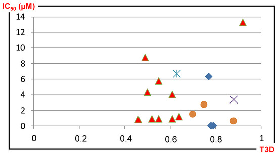 Correlation of the IC50/T3D values for 17 s round hits derived from five first round hits (in separate color) is shown on Figure 5. (Note: 2D similarity is over 0.8 for all the compounds according to the selection criteria and the hit criteria: IC50 ≤ 2 μM).