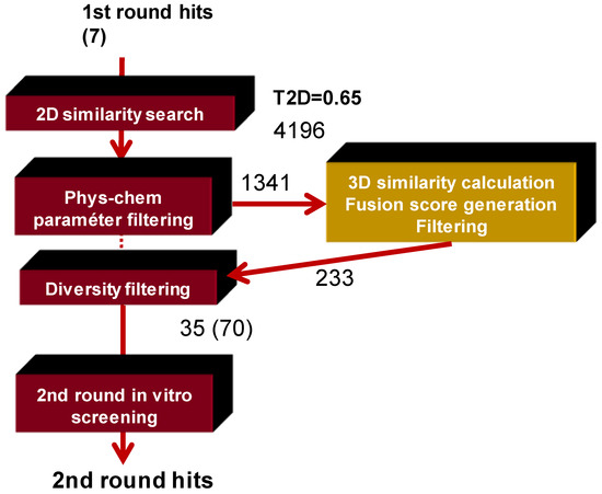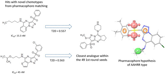 The T2D and T3D similarities of the second rounds screening library (104) towards the corresponding first round hits were between T2D = 0.8–0.98/T3D = 0.35–0.95, and for the hits (17) were between T2D = 0.80–0.93; T3D = 0.47–0.91.