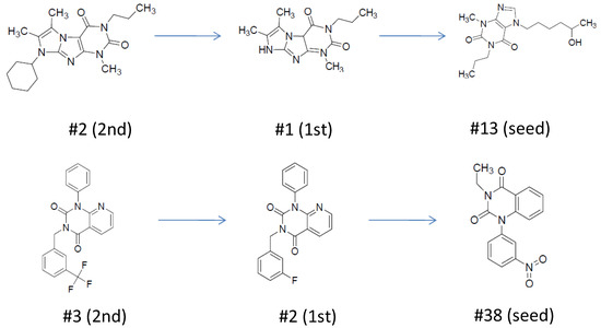 In all cases the reference chemotypes (scaffolds) had slightly or significantly been changed leading to “scaffold hopping”. The structural motifs of the reference compounds were reflected in the eight compounds; however, in many cases in a virtually “rearranged” manner (see Figure 11).