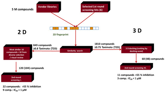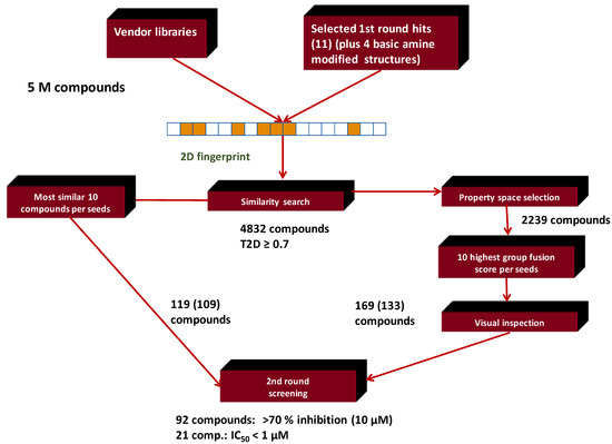 In vitro biological screening involved 2D ligand similarity based focused libraries. The second round hit refinement (validation) library was generated by a sophisticated (sequential or parallel) integration of various additional techniques such as 3D ligand- and structure-based modelling, pharmacophore matching, based on the activity results of the first round. The rationale behind this workflow is that (a) in many cases, VS methods and in vitro HTS were combined [30] and found complementary to each other [31,32]; (b) 2D similarity search allows us to select potential candidates from multimillion commercial libraries, providing compounds with reasonable diversity for testing (c) after the first round screening based on the acceptable number of hit structures the 2D similarity approaches could be combined (sequentially or parallel) with more computation demanding 3D ligand or SB methods in order to increase potency and/or structural novelty.