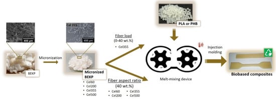 In the present work, the impact of the micronized fiber load and the effect of their aspect ratio on the properties of green composites with two distinct grades of both PLA and PHB matrices were evaluated. The four bio-based polymeric matrices (i.e., PLA 3D860, PLA 3100HP, PHB P209E, and PHB P226) were selected according to their mechanical properties, melt flow index, and recommended uses [27,28]. To assess the impact of the micronized fibers’ load, Cel355 fibers with an intermediate aspect ratio (26.6) were melt-mixed with the thermoplastic matrices. To study the effect of the aspect ratio of the fibers, four micronized fibers with distinct aspect ratios and BEKP (Table 1) were also melt-mixed with all four thermoplastic matrices for a fixed fiber load of 40 wt.% (Figure 1).