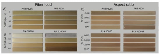 Digital photographs of the PHB- and PLA-based composites with: (A) different Cel355 loads (0, 10, 30 and 40 wt.%), and (B) with micronized fibers with distinct aspect ratios and non-micronized BEKP fibers.
