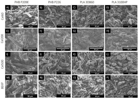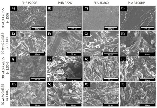 SEM micrographs of the fractured surfaces of (A–D) the neat PHB and PLA matrices and of (E–P) the corresponding composites reinforced with different Cel355 loads: (E–H) 10 wt.%, (I–L) 30 wt.% and (M–P) 40 wt.%.