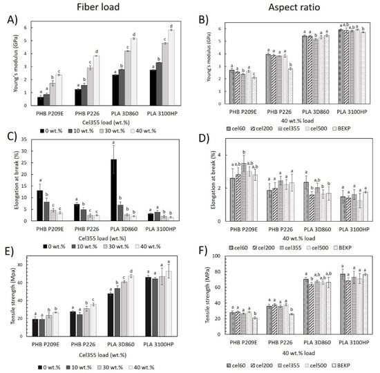 Tensile properties of the PHB and PLA-based composites (A,C,E) reinforced with different loads of Cel355 and (B,D,F) reinforced with fibers having different aspect ratios for a load of 40 wt.%. Different letters (a,b,c,d) indicate statistically significant differences (p < 0.05).