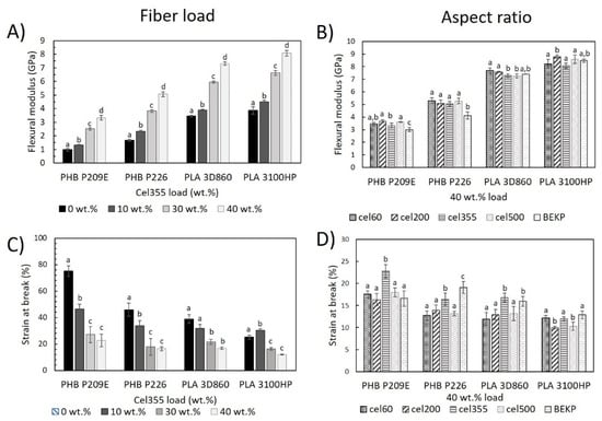 Flexural properties of) the PHB- and PLA-based composites reinforced (A,C) with different loads of Cel355 and (B,D) with fibers having different aspect ratios for a load of 40 wt.%. Different letters (a,b,c,d) indicate statistically significant differences (p < 0.05).