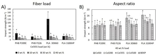 Impact properties of PHB- and PLA-based composites (A) reinforced with different loads of Cel355 and (B) reinforced with fibers having different aspect ratios for a load of 40 wt.%. Different letters (a,b,c) indicate statistically significant differences (p < 0.05).
