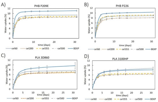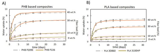 Water uptake as function of time for: (A) PHB- and (B) PLA-based composites reinforced with Cel355.